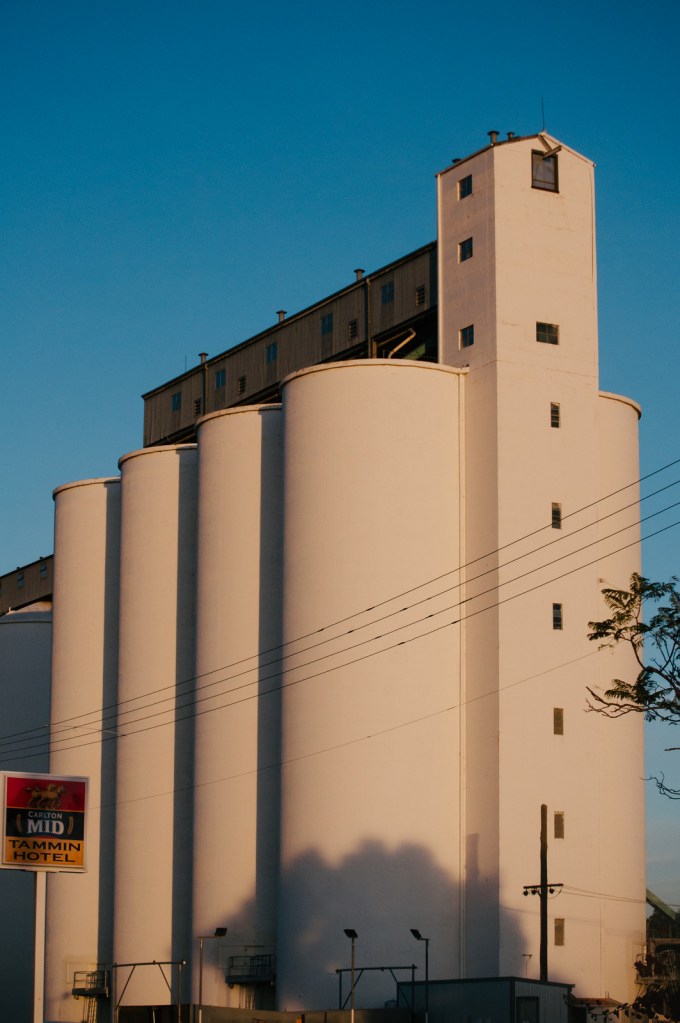 Grain cells and wheat bins populate the rail line that runs parallel to the highway. The grain is loaded on to trains bound for the grain receival point in Kwinana.